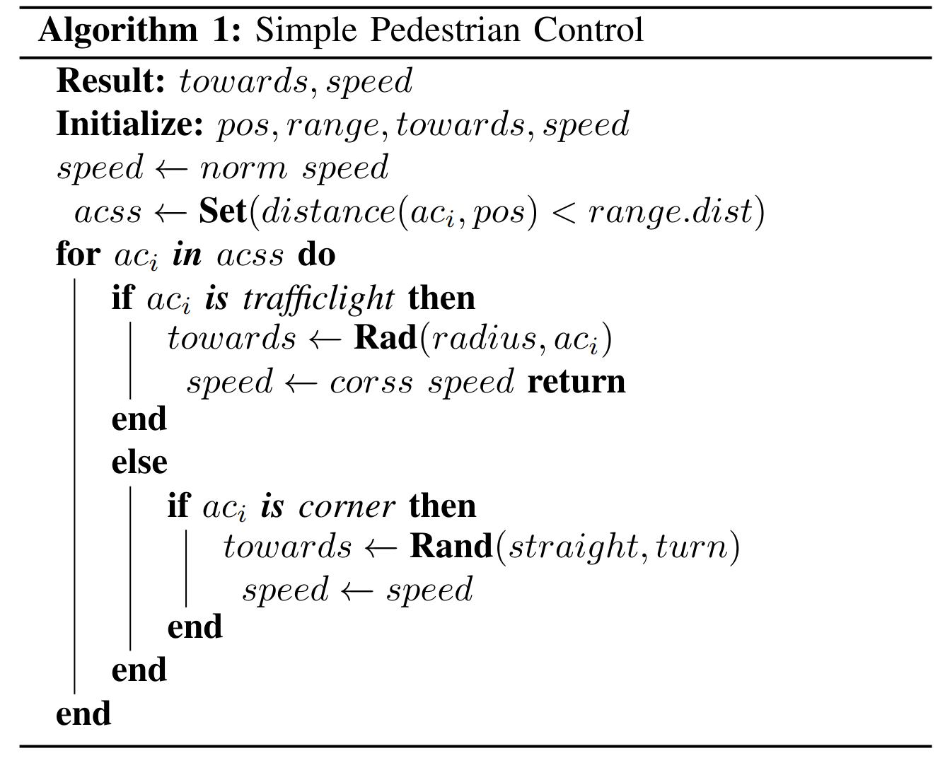 For pedestrian control in the Co-Simulate link, there is the following algorithm. It controls pedestrian behavior during the time between two timestamps, where $pos$ is the position, $range$ is perception range (only 160 degrees in front of the eyes), $towards$ is the absolute angle of orientation, and $speed$ is the speed of a pedestrian, respectively.