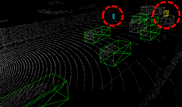 It is not difficult to find that the PointPillar model can basically accurately detect small objects in the distance. Voxel R-CNN has correctly and completely detected all vehicles in this scene, even those with severe occlusion.
